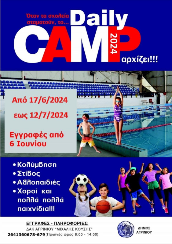 Στις 6 Ιουνίου ξεκινούν οι εγγραφές για συμμετοχή στο Daily Camp 2024 που διοργανώνεται στο Δημοτικό Αθλητικό Κέντρο Αγρινίου «Μιχάλης Κούσης».