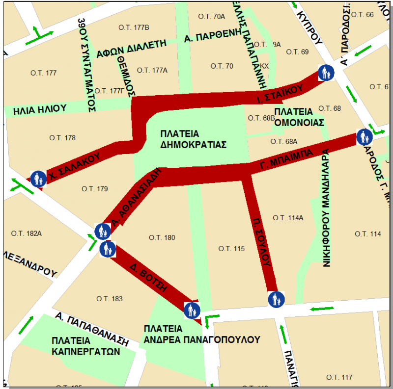 - Οι θέσεις ΑΜΕΑ που υπάρχουν ήδη εντός των πεζοδρομούμενων οδών είναι συνολικά 3 και συγκεκριμένα: 2 θέσεις επί της οδού Βότση και 1 θέση επί της οδού Ι. Σταϊκου. Οι θέσεις αυτές δεν καταργούνται και παραμένουν ως έχουν. Όπως ανακοινώθηκε ήδη, η είσοδος οχημάτων ΑΜΕΑ στους πεζοδρόμους επιτρέπεται όλο το 24ωρο και σαφώς επιτρέπεται και η στάθμευση στις ειδικές θέσεις ΑΜΕΑ. Αυτό που ισχύει ήδη και δεν αλλάζει είναι ότι, στις θέσεις που προβλέπονται για φορτοεκφόρτωση, δεν επιτρέπεται η στάθμευση οχημάτων αλλά επιτρέπεται μόνο η στάση για φορτοεκφόρτωση.