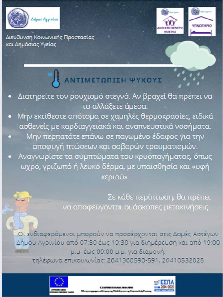 Η Διεύθυνση Κοινωνικής Προστασίας και Δημόσιας Υγείας του Δήμου Αγρινίου, ενόψει εκδήλωσης επικίνδυνων καιρικών φαινομένων, ενημερώνει ότι οι Δομές Αστέγων διαθέτουν θερμαινόμενους χώρους για διημέρευση και φιλοξενία.