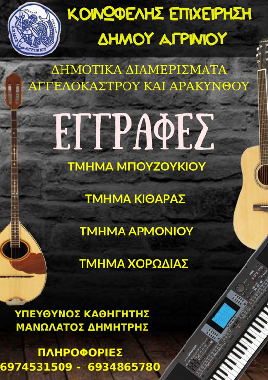 Ο Δήμος Αγρινίου ενημερώνει για εγγραφές σε τμήματα μπουζουκιού, κιθάρας, αρμονίου και χορωδίας στα Δημοτικά Διαμερίσματα Αγγελοκάστρου και Αρακύνθου.