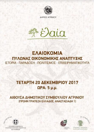 Την Τετάρτη 20 Δεκεμβρίου στις 5:00 μ.μ. στην αίθουσα του Δημοτικού Συμβουλίου Αγρινίου (Πρώην Τράπεζα Ελλάδος, Αναστασιάδη 1) θα διεξαχθεί εκδήλωση με θέμα: ‘Ελαιοκομία-Πυλώνας Οικονομικής Ανάπτυξης’ για την προβολή του θεσμού των εκδηλώσεων ἐλαία και την ανάδειξη του πρωταγωνιστικού ρόλου της καλλιέργειας της ελιάς τόσο σε τοπικό όσο και σε παγκόσμιο επίπεδο και τη διασύνδεσή της με την επιστήμη, την επιχειρηματικότητα, τη γαστρονομία την παράδοση και τον πολιτισμό.