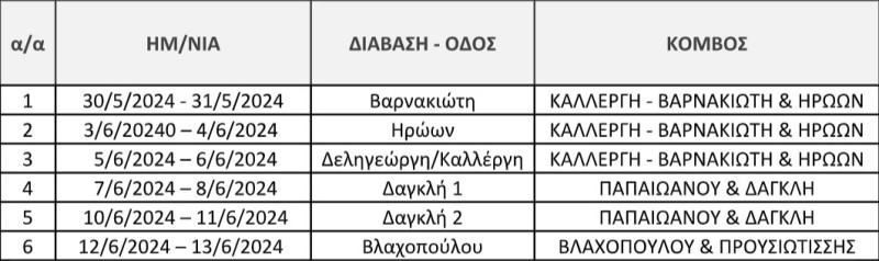 Από αύριο Πέμπτη, 30 Μαΐου 2024 οι εργασίες θα πραγματοποιούνται στις διαβάσεις πεζών των Κόμβων: ΚΑΛΛΕΡΓΗ – ΒΑΡΝΑΚΙΩΤΗ & ΗΡΩΩΝ, ΠΑΠΑΙΩΑΝΟΥ & ΔΑΓΚΛΗ και ΒΛΑΧΟΠΟΥΛΟΥ & ΠΡΟΥΣΙΩΤΙΣΣΗΣ.