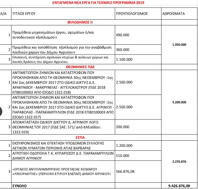 Τα νέα έργα που εντάσσονται στο νέο τεχνικό πρόγραμμα (2019) είναι: