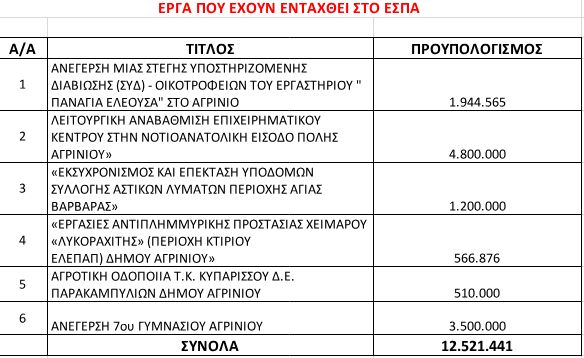 1) Αντιμετώπιση ζημιών και καταστροφών που προκλήθηκαν από τη Θεομηνία της 30ης Νοεμβρίου 1ης και 2ας Δεκεμβρίου του 2017 στο οδικό δίκτυο Αρακύνθου-Μακρυνείας-Αγγελοκάστρου, στο οδικό δίκτυο Αγρινίου- Παραβόλας-Παρακαμπυλίων καθώς και σε άλλα σημεία του οδικού δικτύου του Δήμου Αγρινίου.