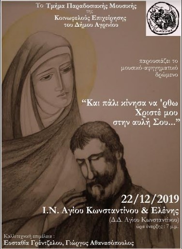 Το Τμήμα Παραδοσιακής Μουσικής της Κοινωφελούς Επιχείρησης του Δήμου Αγρινίου, παρουσιάζει αφιέρωμα με τίτλο «Και πάλι κίνησα να ΄ρθω Χριστέ μου στην αυλή Σου…» την Κυριακή 22 Δεκεμβρίου 2019 και ώρα 7 μ.μ. στον Ιερό Ναό Αγίου Κωνσταντίνου & Ελένης (Δ.Δ. Αγίου Κωνσταντίνου).