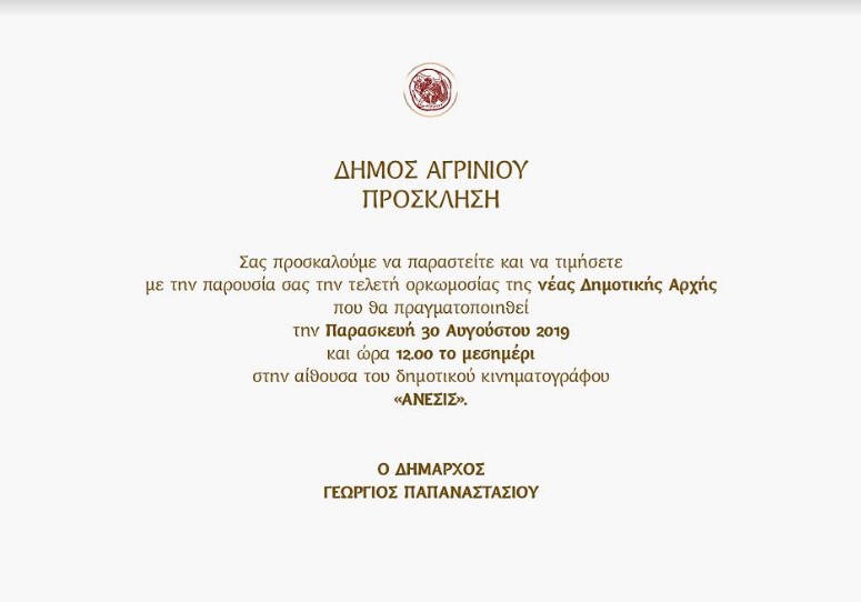 Παρουσία του Σεβασμιότατου Μητροπολίτη Αιτωλίας και Ακαρνανίας κ. Κοσμά και του Σεβασμιότατου Μητροπολίτη Ναυπάκτου και Αγίου Βλασίου κ. Ἱερόθεου θα γίνει την Παρασκευή 30 Αυγούστου η ορκωμοσία του Δημάρχου και των μελών του νέου Δημοτικού Συμβουλίου Αγρινίου.
