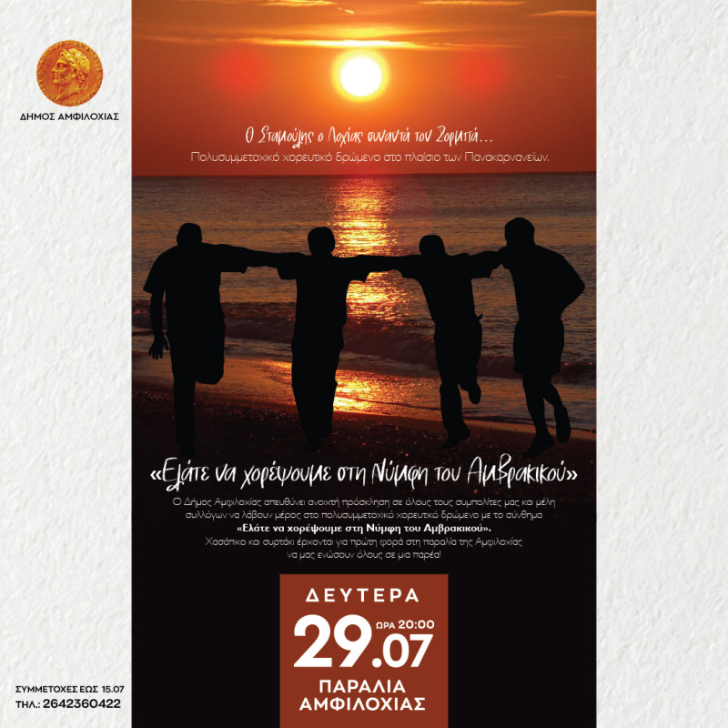 Ο Δήμος Αμφιλοχίας απευθύνει ανοιχτή πρόσκληση σε όλους τους συμπολίτες μας και μέλη συλλόγων να λάβουν μέρος στο πολυσυμμετοχικό χορευτικό δρώμενο με το σύνθημα «Ελάτε να χορέψουμε στη Νύμφη του Αμβρακικού».