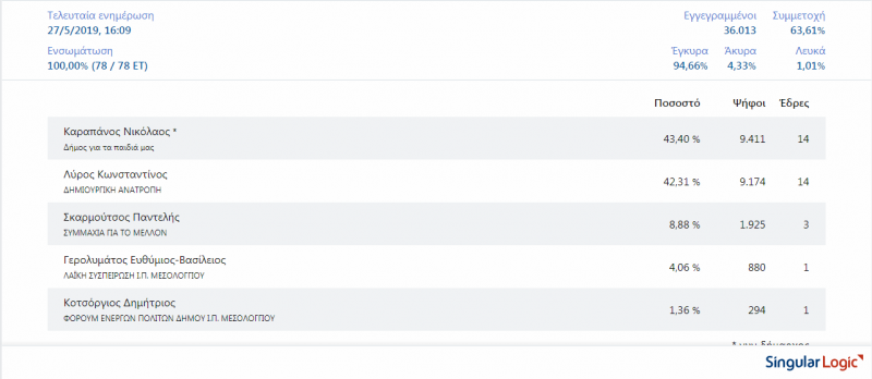 Συνολικά Αποτελέσματα στo Δήμο: ΙΕΡΑΣ ΠΟΛΗΣ ΜΕΣΟΛΟΓΓΙΟΥ – 78 από 78 Εκλογικά Τμήματα