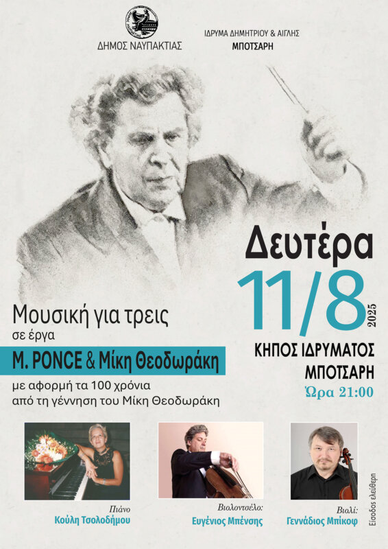 Στο πλαίσιο των εκδηλώσεων του Δήμου Ναυπακτίας για το Καλοκαίρι του 2025, και με αφορμή τη συμπλήρωση των 100 χρόνων από τη γέννηση του Μίκη Θεοδωράκη, παρουσιάζεται στον Κήπο του Αρχοντικού Μπότσαρη (Ιδρύματος Δημητρίου και Αίγλης Μπότσαρη), τη Δευτέρα, 11 Αυγούστου 2025 και ώρα 21:00, η μουσική εκδήλωση «Μουσική για Τρεις» με έργα M.PONCE και Μίκη Θεοδωράκη.