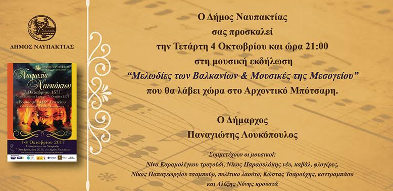 Εκδηλώσεις Ο Δήμος Ναυπακτίας σας προσκαλεί σε μία σειρά από εκδηλώσεις πολιτιστικού ενδιαφέροντος 4 Οκτ 2017 AgrinioTimes Share Tweet ☆ Ακολουθήστε μας στο Google News Σχετικά θέματα: Advertisement Τελευταία νέα →24 Οκτ 2025 12:05Δ.ΕΠ.Α. Εμπορίας: Από το φυσικό αέριο στην καθετοποίηση και τη διαφοροποίηση24 Οκτ 2025 11:0328η Οκτωβρίου – Αγρίνιο: Στις 11 η Μαθητική Παρέλαση, το διήμερο πρόγραμμα Εορτασμού24 Οκτ 2025 10:54Δήμος Ι.Π. Μεσολογγίου: Έκτακτη σύσκεψη για την κακοκαιρία – «Ζητώ ειλικρινά συγνώμη», ανέφερε ο Διαμαντόπουλος24 Οκτ 2025 10:32Ημερήσιες Προβλέψεις για τα Ζώδια (24/10)24 Οκτ 2025 10:26Εορτολόγιο: 24 Οκτωβρίου τιμάται από την Εκκλησία η Αγία Σεβαστιανή24 Οκτ 2025 10:22Γεγονότα που σημειώθηκαν σαν σήμερα (24/10)24 Οκτ 2025 01:41UEL – 2η Αγωνιστική League Phase: Προηγήθηκε ο Παναθηναϊκός, αλλά στο τέλος ηττήθηκε από τη Φέγενορντ24 Οκτ 2025 01:25Ο Καιρός (24/10): Ασθενής βροχόπτωση και ηλιοφάνεια στο Αγρίνιο, έως 23 βαθμούς Κελσίου η θερμοκρασία23 Οκτ 2025 23:49UECL – 2η Αγωνιστική League Phase: «Εξάσφαιρη» η Α.Ε.Κ. κόντρα στην Αμπερντίν!23 Οκτ 2025 22:30«Απαραίτητο Φως»: Ο Αλέξης υποψιάζεται τη Λουίζ