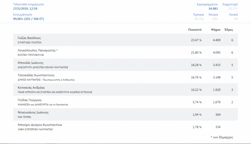 Συνολικά Αποτελέσματα στo Δήμο: ΝΑΥΠΑΚΤΙΑΣ – 106 από 106 Εκλογικά Τμήματα