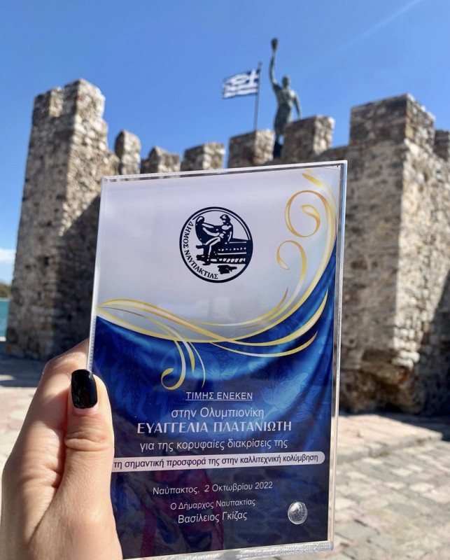 Ο Δήμος Ναυπακτίας τίμησε την Ολυμπιονίκη και Παγκόσμια Πρωταθλήτρια Ευαγγελία Πλατανιώτη «για τις κορυφαίες διακρίσεις της και τη σημαντική προσφορά της στην καλλιτεχνική κολύμβηση».