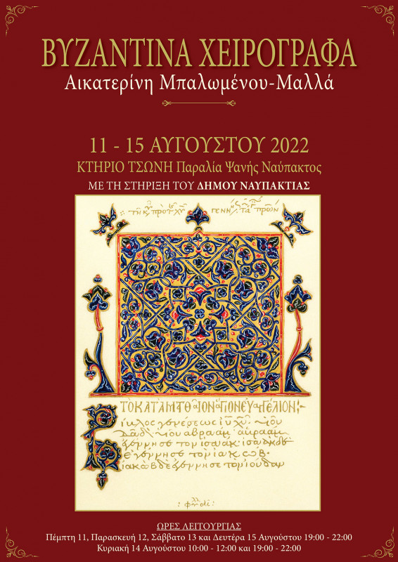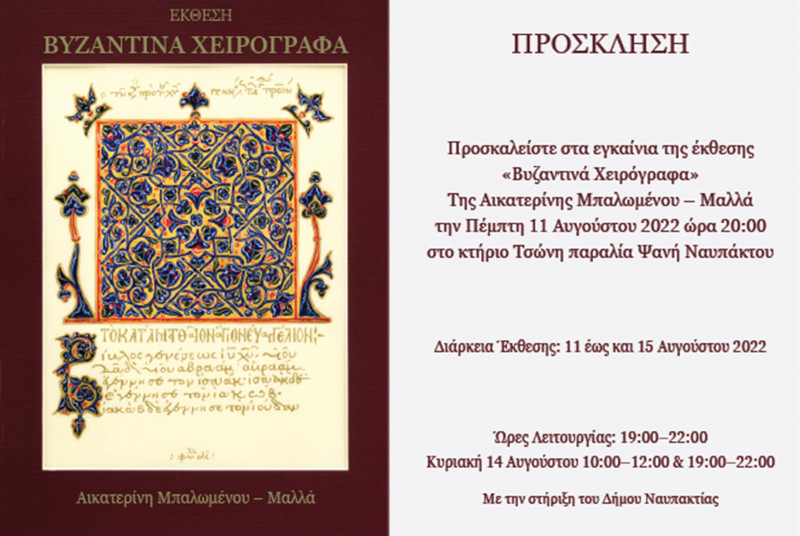 Με τη στήριξη του Δήμου Ναυπακτίας, η ζωγράφος-αγιογράφος Αικατερίνη Μπαλωμένου-Μαλλά παρουσιάζει στο Κτίριο Τσώνη (ισόγειο, είσοδος από παραλία Ψανής) την Έκθεσή της «Βυζαντινά Χειρόγραφα».