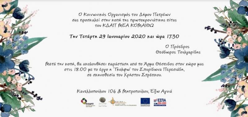 Ο Κοινωνικό Οργανισμός του Δήμου Πατρέων σας προσκαλεί στην κοπή της πρωτοχρονιάτικης πίτας του ΚΔΑΠ ΜΕΑ ΚΟΜΑΙΘΩ την Τετάρτη, 29 Ιανουαρίου 2020 και ώρα 17:30 και στη συνέχεια θα ακολουθήσει θεατρική παράσταση.