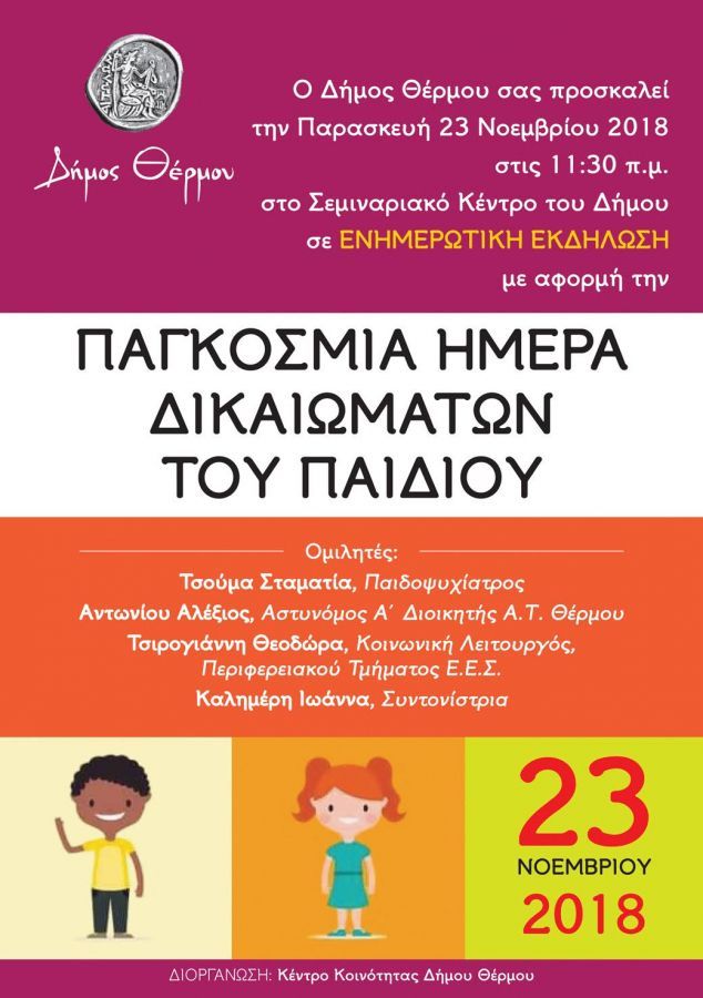 Ο Δήμος Θέρμου σας προσκαλεί την Παρασκευή 23 Νοεμβρίου 2018 στις 11:30 π.μ. στο Σεμιναριακό Κέντρο του Δήμου σε ενημερωτική εκδήλωση με αφορμή την Παγκόσμια Ημέρα Δικαιωμάτων του Παιδιού.