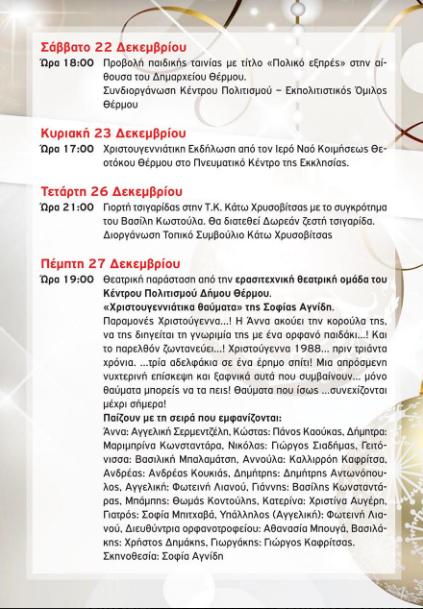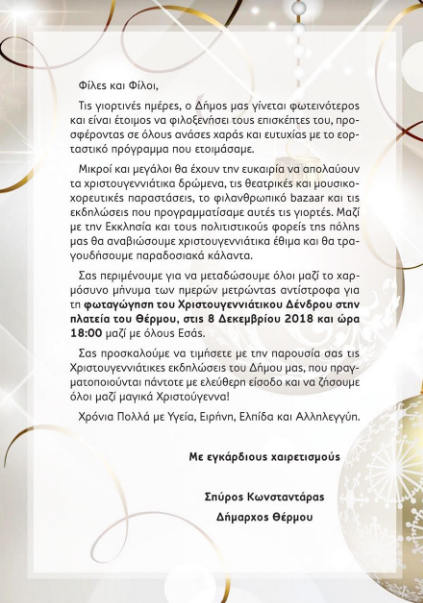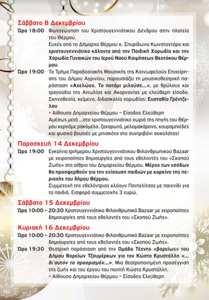 Εκδηλώσεις Δήμος Θέρμου: Χριστούγεννα 2018 7 Δεκ 2018 AgrinioTimes Share Tweet ☆ Ακολουθήστε μας στο Google News Σχετικά θέματα: Advertisement Τελευταία νέα →23 Μαρ 2026 01:18Ο Καιρός (23/03): Ηλιοφάνεια με αραιή συννεφιά στο Αγρίνιο, έως 17 βαθμούς Κελσίου η θερμοκρασία23 Μαρ 2026 01:08Νοσοκομείο Αγρινίου: Θερμό επεισόδιο με Ρομά έξω από τα Επείγοντα, «κλούβες» της ΕΛ.ΑΣ. στο σημείο22 Μαρ 2026 23:51Stoiximan SL1 – Γιάννης Αναστασίου: «Το πρόβλημα είναι ό,τι δεν τελειώσαμε τις φάσεις»22 Μαρ 2026 23:25Stoiximan SL1 – Ζεράρ Σαραγόσα: «Πανσερραϊκός και Παναιτωλικός μπαίνουν καλύτερα στα Play Outs»22 Μαρ 2026 21:00Stoiximan SL1 – Παναιτωλικός: «Λευκή» ισοπαλία απέναντι στον προτελευταίο Πανσερραϊκό!22 Μαρ 2026 19:50Stoiximan SL1 – Τέλος 1ου Ημιχρόνου: Ο Παναιτωλικός δε σκόραρε παρά τις μεγάλες ευκαιρίες22 Μαρ 2026 18:37Stoiximan SL1 – 26η Αγωνιστική: Οι ενδεκάδες του παιχνιδιού Παναιτωλικός – Πανσερραϊκός22 Μαρ 2026 17:01Χριστίνα Σταρακά: «Στην Ιερή Πόλη του Μεσολογγίου ζήσαμε μια εμβληματική στιγμή εθνικής μνήμης και υπερηφάνειας»22 Μαρ 2026 16:43Α2 Ε.Σ.ΚΑ.ΒΔ.Ε. – Παναιτωλικός: Ηττήθηκε από τον Λέοντα Ι.Π. Μεσολογγίου και παραμένει στην ίδια κατηγορία22 Μαρ 2026 16:19Γιώργος Παπαναστασίου: «Το Μεσολόγγι έπεσε, αλλά η Ελλάδα υψώθηκε»