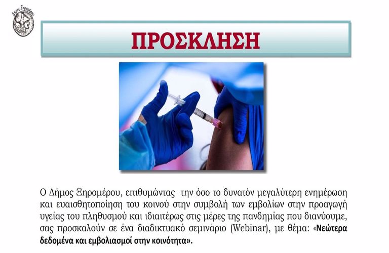 Ο Δήμος Ξηρομέρου, επιθυμώντας την όσο το δυνατόν μεγαλύτερη ενημέρωση και ευαισθητοποίηση του κοινού στην συμβολή των εμβολίων στην προαγωγή υγείας του πληθυσμού και ιδιαιτέρως στις μέρες της πανδημίας που διανύουμε, σας προσκαλούν σε ένα διαδικτυακό σεμινάριο (Webinar), με θέμα: «Νεώτερα δεδομένα και εμβολιασμοί στην κοινότητα».
