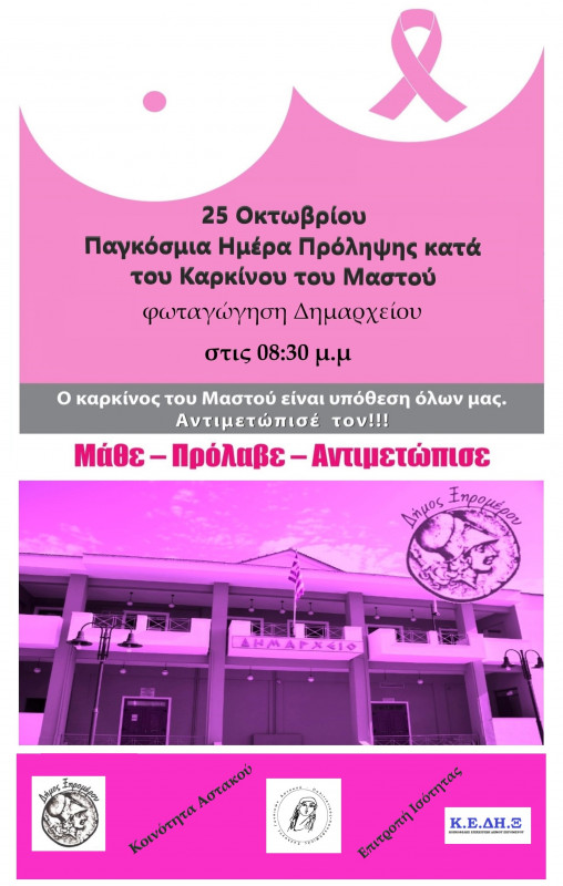 Συμμετέχουμε στην παγκόσμια φωταγώγηση κτηρίων και στην εκστρατεία της Ελληνικής Αντικαρκινικής Εταιρείας την Τρίτη στις 25 Οκτωβρίου και ώρα 8:30 μ.μ. με φωταγώγηση του Δημαρχείου.