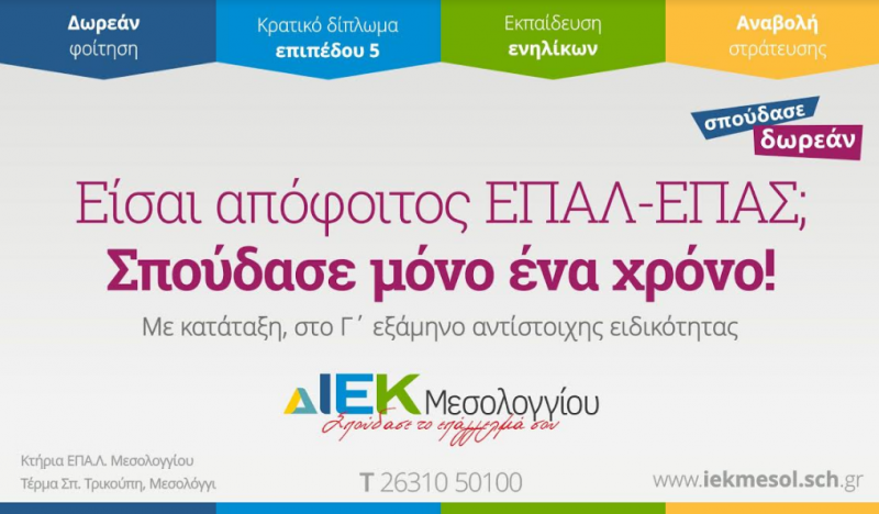 Οι αιτήσεις για κατάταξη υποβάλλονται στη Γραμματεία του Δ.ΙΕΚ Μεσολογγίου, το αργότερο μέχρι 28/9/2018.