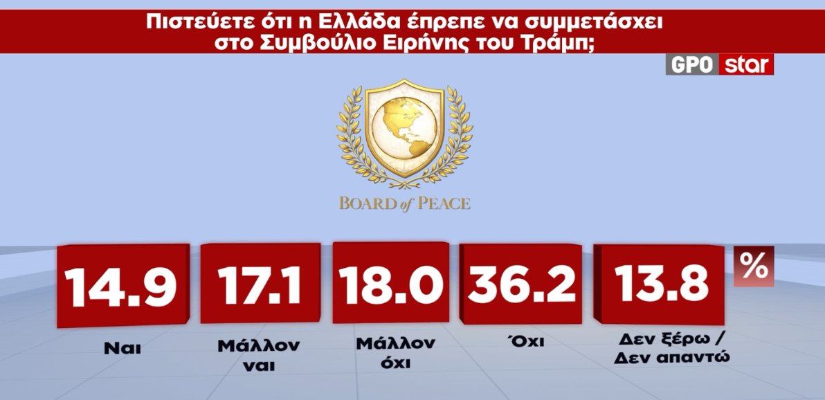 Τέλος, στο ερώτημα αν η Ελλάδα έπρεπε να συμμετάσχει στο Συμβούλιο Ειρήνης του Τραμπ το 54,2% των ερωτηθέντων απαντούν όχι και μάλλον όχι, ενώ το 32% απαντούν ναι και μάλλον ναι.