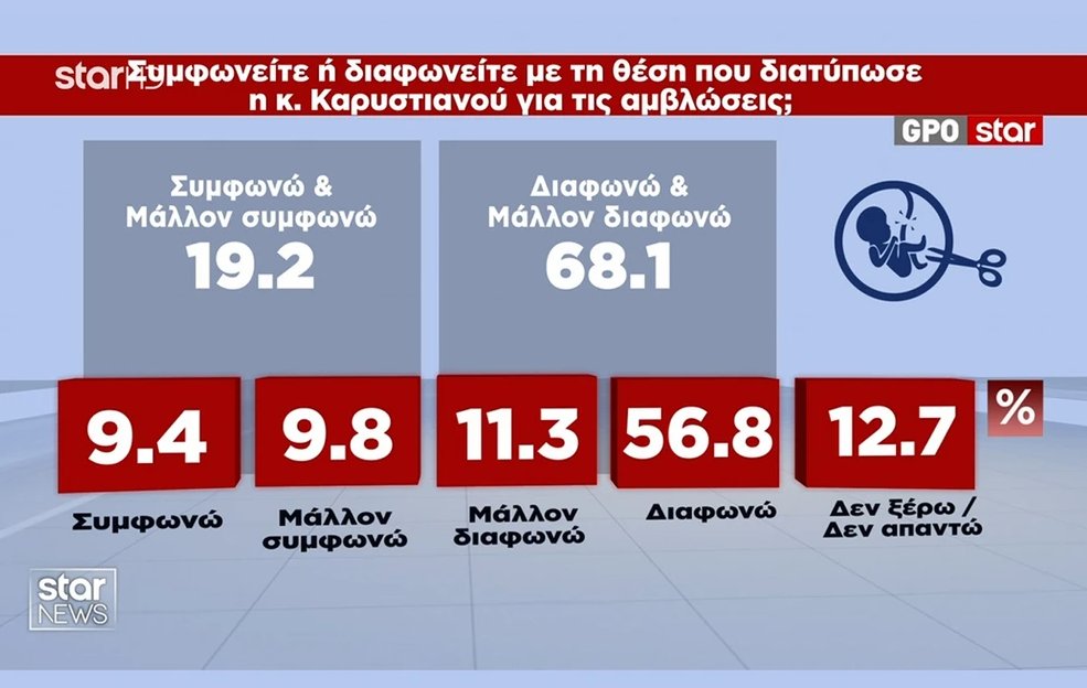 Με την άποψη της Μ. Καρυστιανού για τις αμβλώσεις συμφωνεί και μάλλον συμφωνεί το 19,2%, ενώ διαφωνεί και μάλλον διαφωνεί το 68,1%.