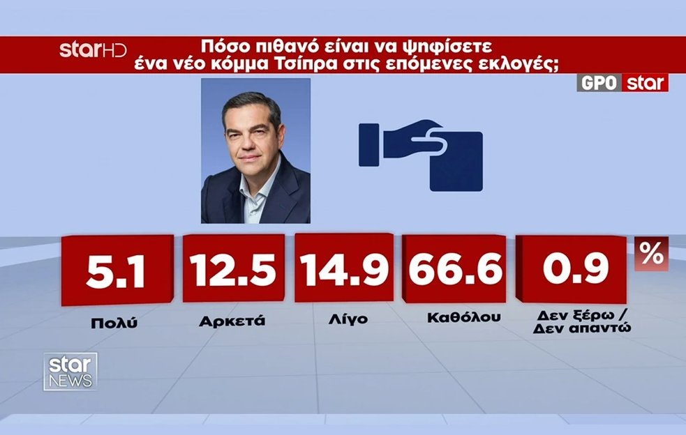 Το 17,6% των ερωτηθέντων δηλώνει ότι είναι πολύ και αρκετά πιθανό να ψηφίσει ένα νέο κόμμα Τσίπρα στις επόμενες εκλογές.