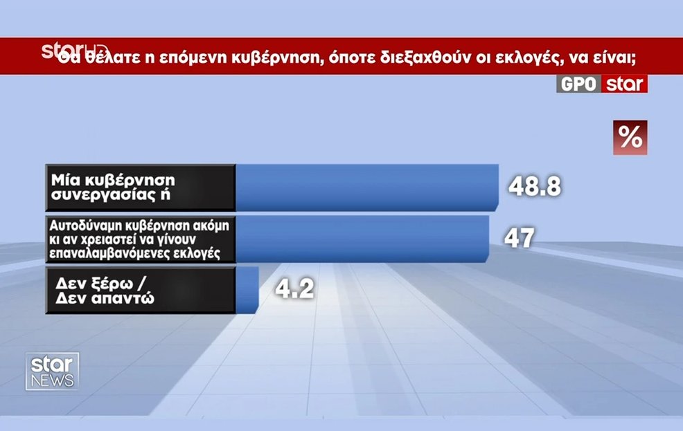 Το 48,8% προτιμά μια κυβέρνηση συνεργασίας μετά τις εθνικές εκλογές, ενώ το 47% προτιμά Αυτοδύναμη Κυβέρνηση.