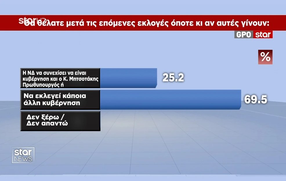 Η μεγάλη πλειοψηφία, όμως, με ποσοστό 69,5%, προτιμά να εκλεγεί κάποια άλλη κυβέρνηση, ενώ το 25,2% θέλει να συνεχίσει να κυβερνά η Ν.Δ. με Πρωθυπουργό τον Κ. Μητσοτάκη.