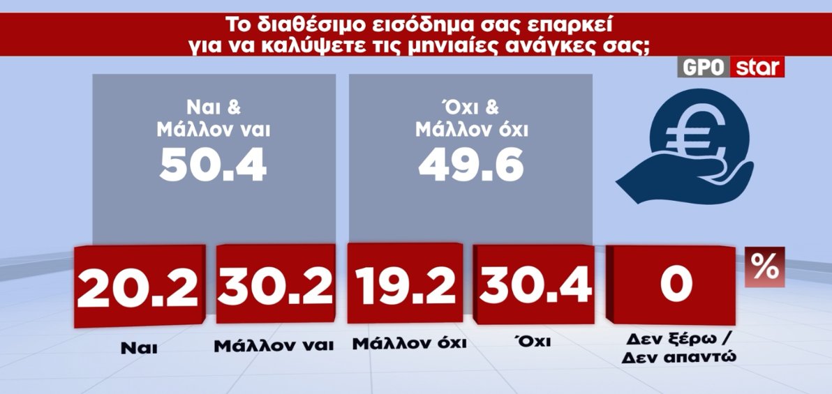 Οι μισοί Έλληνες, ποσοστό 49,6%, δηλώνουν ότι το διαθέσιμο εισόδημα τους δεν αρκεί για να καλύψουν τις μηνιαίες ανάγκες τους, ενώ το 50,4% δηλώνουν ότι αρκεί.