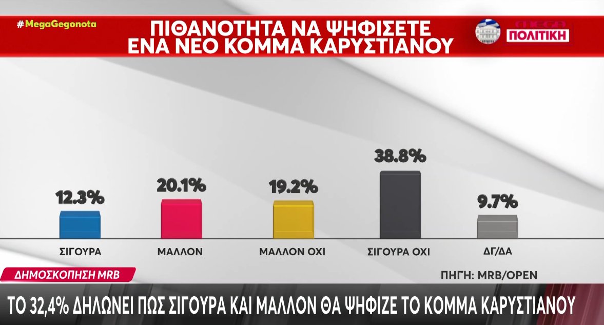 Το 32,4% των ερωτηθέντων στη μέτρηση της MRB δηλώνει ό,τι «σίγουρα» και «μάλλον» θα ψήφιζε ένα νέο κόμμα από την Μαρία Καρυστιανού.