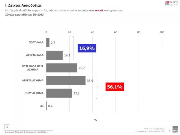 Στο ερώτημα «πώς πιστεύετε ότι πάνε τα πράγματα γενικά στη χώρα μας», το 56,1% απαντά «Πολύ άσχημα-Αρκετά άσχημα», ενώ το 16,9% απαντά «Πολύ καλά-Αρκετά καλά».Στο ερώτημα, «πώς κρίνετε σε γενικές γραμμές σήμερα την οικονομική κατάσταση της Ελλάδας», το 59,4% απαντά «Πολύ κακή – κακή» και το 12,9% απαντά «Πολύ καλή-καλή».
