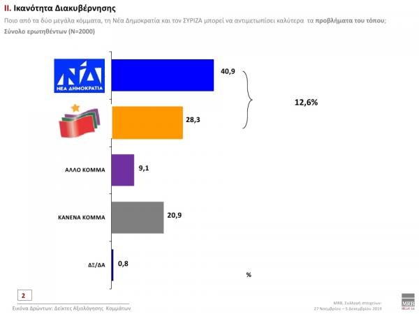 Διατηρεί τη μεγάλη διαφορά από τον ΣΥ.ΡΙΖ.Α. η Νέα Δημοκρατία στη δημοσκόπηση που έκανε η MRB. Οι τάσεις της εταιρείας δείχνουν συντριπτικό προβάδισμα 12,3 μονάδων του κυβερνώντος κόμματος έναντι της αξιωματικής αντιπολίτευσης ενώ μεγάλη είναι και η διαφορά στην καταλληλότητα για πρωθυπουργός του Κυριάκου Μητσοτάκη έναντι του Αλέξη Τσίπρα.
