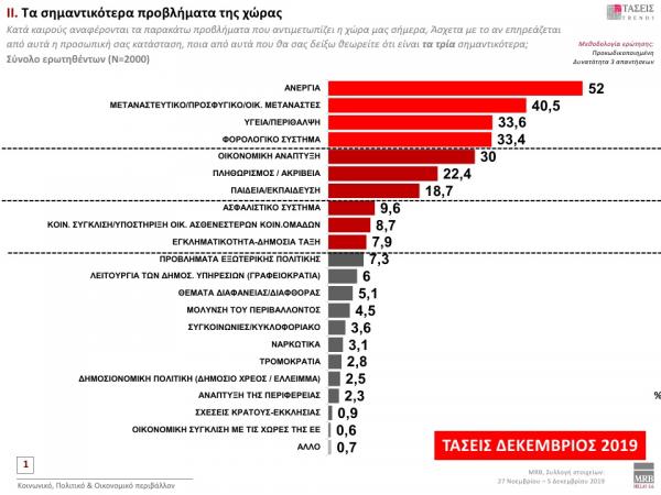 Τα πέντε σημαντικότερα προβλήματα της χώρας είναι η ανεργία με 52%, το μεταναστευτικό/προσφυγικό/οικ. μετανάστες με 40,5%, η υγεία/περίθαλψη με 33,6%, το φορολογικό σύστημα με 33,4% και η οικονομική ανάπτυξη με 30%.