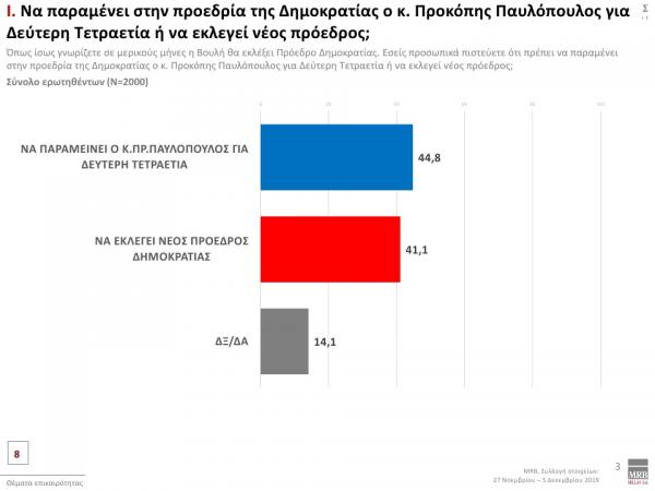 Για την εκλογή Προέδρου Δημοκρατίας σημαντικό ποσοστό των πολιτών (44,8%) δηλώνουν ότι θα επιθυμούσαν να παραμείνει ο Προκόπης Παυλόπουλος για δεύτερη θητεία ενώ το 41,1% επιθυμεί νέο πρόσωπο στην θέση του Προέδρου της Δημοκρατίας.