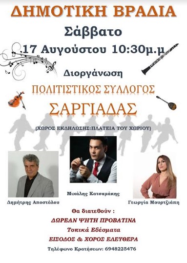 Η Δημοτική Βραδιά (Αντάμωμα Σαργιαδιωτών) θα πραγματοποιηθεί το Σάββατο 17 Αυγούστου στις 22.30 στη πλατεία του χωριού.