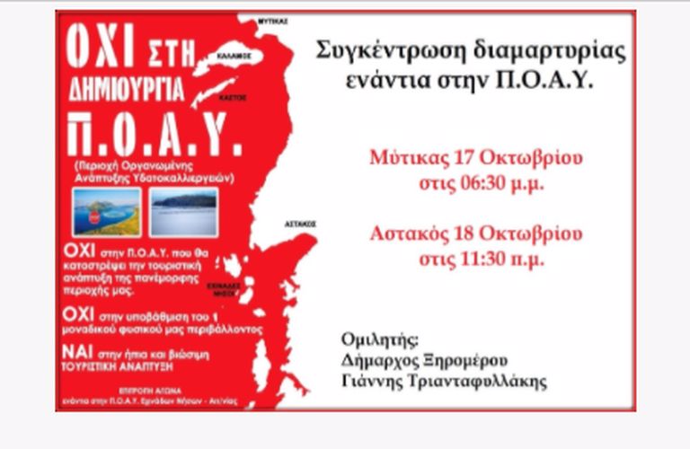 Η Επιτροπή Αγώνα θα διοργανώσει δύο ενημερωτικές συγκεντρώσεις σε Μύτικα και Αστακό, με κύριο ομιλητή τον Δήμαρχο, ο οποίος θα αναφερθεί στο σοβαρό για το μέλλον της περιοχής θέμα της Περιοχής Οργανωμένης Ανάπτυξης Υδατοκαλλιεργειών (Π.Ο.Α.Υ.).