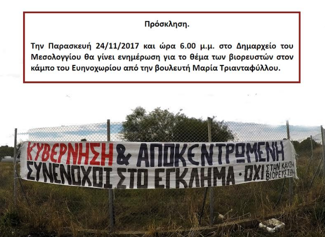 2. Παρέμβαση στην εκδήλωση ενημέρωσης της βουλευτού του ΣΥΡΙΖΑ Αιτωλοακαρνανίας Μ.Τριανταφύλλου, σχετικά με το θέμα των Βιορευστών. Ώρα: 18:00, στο Δημαρχείο Μεσολογγίου (2ος όροφος Ραδιομέγαρο).