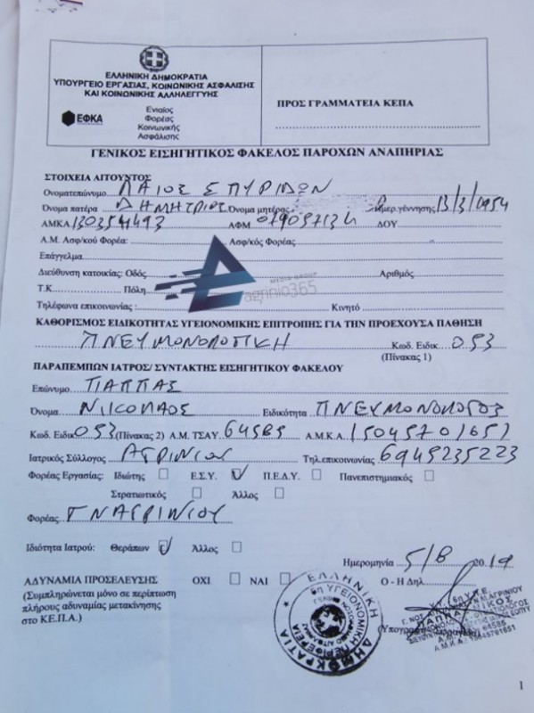 Ο κ. Λάϊος έχει χρόνια αποφρακτική πνευμονοπάθεια και αναπνευστική ανεπάρκεια ενώ το συνολικό ποσοστό αναπηρίας του ανέρχεται στο 80%.