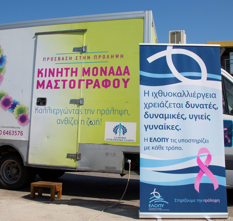 Στο πλαίσιο των δράσεων κοινωνικής ευθύνης προς τους εργαζόμενους στις εταιρείες-μέλη της, η Ελληνική Οργάνωση Παραγωγών Υδατοκαλλιέργειας (ΕΛΟΠΥ) υλοποιεί, σε συνεργασία με την Ελληνική Αντικαρκινική Εταιρεία, ένα πρόγραμμα για δωρεάν μαστογραφικό έλεγχο σε όλες τις γυναίκες που εργάζονται στις εταιρείες-μέλη της και στους συγγενείς πρώτου βαθμού όλων των εργαζομένων.