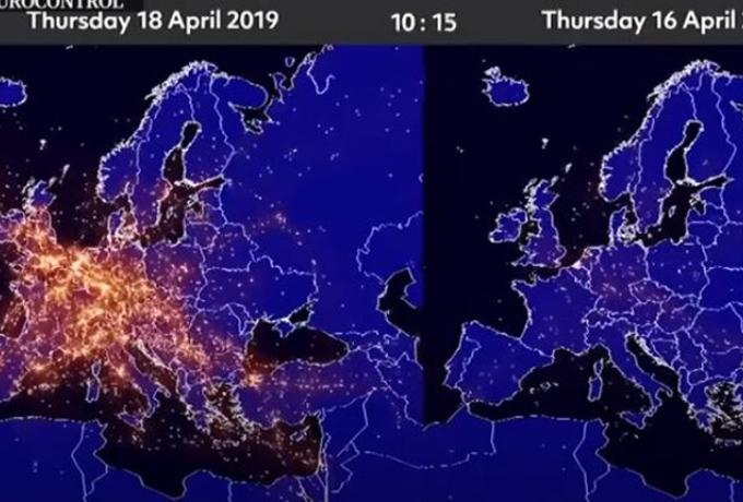 Ενδεικτικό της κατάστασης που έχει διαμορφωθεί, είναι η φωτογραφία που κυκλοφόρησε ο διεθνής αεροπορικός οργανισμός Eurocontrol, στο οποίο απεικονίζεται γραφικά το πλήθος πτήσεων στον ευρωπαϊκό εναέριο χώρο τον Απρίλιο του 2019 και αυτές του φετινού Απριλίου.