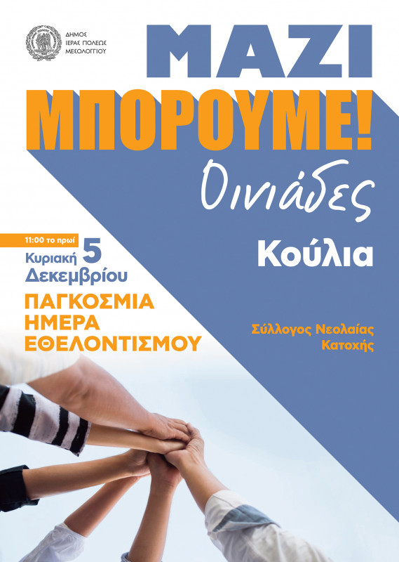 Με πρωτοβουλία του Δημάρχου Ι.Π. Μεσολογγίου Κώστα Λύρου στο πλαίσιο της Διεθνούς Ημέρας Εθελοντισμού θα πραγματοποιηθούν τη Κυριακή 5 Δεκεμβρίου 2021 και ώρα 11:00 π.μ. τρείς δράσεις σε τρία διαφορετικά σημεία του Δήμου.