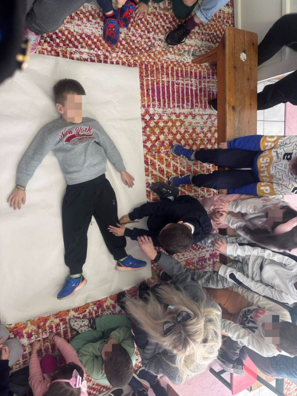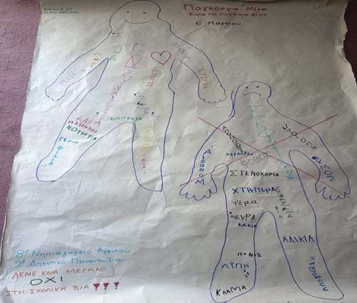 Τέλος, σχεδίασαν σε χαρτί μέτρου το περίγραμμα παιδιών όπου έγραψαν σκέψεις, συναισθήματα προτάσεις και λύσεις για τον σχολικό εκφοβισμό μέσα από τα αθώα παιδικά τους μάτια