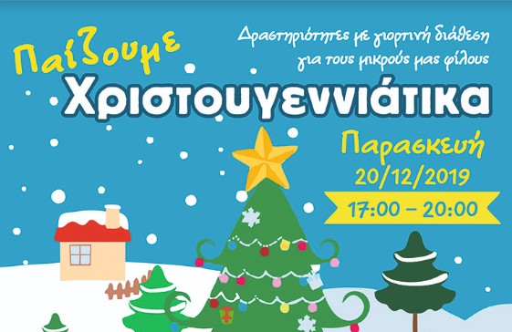 Σας περιμένουμε με γιορτινή διάθεση την Παρασκευή, 20 Δεκεμβρίου 2019, από τις 17:00 έως τις 20:00 στον τοπικό κόμβο Local HUB, στην πλατεία Κέννεντυ στο Μεσολόγγι, για να διασκεδάσουμε με Χριστουγεννιάτικες δραστηριότητες τους μικρούς μας φίλους.