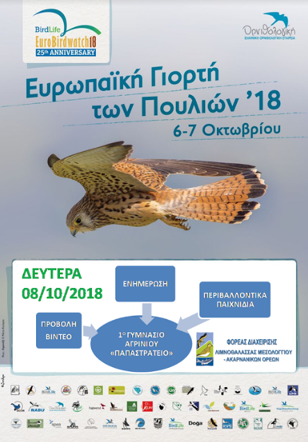 Μετά από πρόσκληση της Ελληνικής Ορνιθολογικής Εταιρείας- συντονιστή στην Ελλάδα των εκδηλώσεων εορτασμού της 25ης Ευρωπαϊκής Γιορτής Πουλιών EUROBIRDWATCH 2018, ο Φορέας Διαχείρισης Λιμνοθάλασσας Μεσολογγίου – Ακαρνανικών Ορέων διοργάνωσε μια δράση ενημέρωσης και ευαισθητοποίησης των μαθητών της Α’ γυμνασίου του 1ου Γυμνασίου Αγρινίου «Παπαστράτειου».
