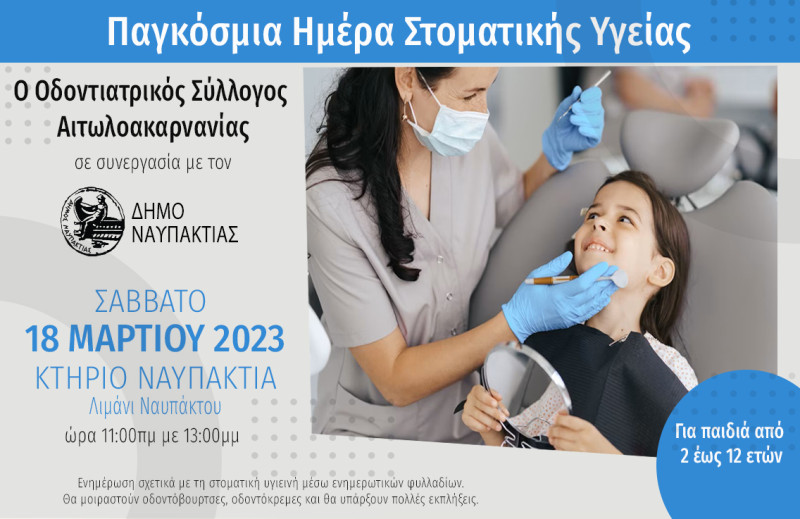 Με αφορμή τη Παγκόσμια Ημέρα Στοματικής Υγείας, ο Οδοντιατρικός Σύλλογος Αιτωλοακαρνανίας σε συνεργασία με τον Δήμο Ναυπακτίας, διοργανώνουν δράση για τη στοματική υγιεινή, αυτό το Σάββατο, 18 Μαρτίου και ώρα 11:00 π.μ. με 13:00 μ.μ. στο Κτίριο «Ναυπακτία» (Λιμάνι),