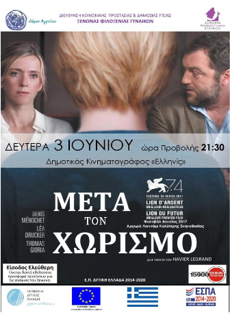Στο πλαίσιο δράσεων ευαισθητοποίησης της κοινωνίας σχετικά με την ενδοοικογενειακή βία και των επιπτώσεών της θα πραγματοποιηθεί προβολή ταινίας, συναφούς θεματολογίας, τη Δευτέρα 3 Ιουνίου 2019 και ώρα 21:30 στον Δημοτικό Κινηματογράφο “Ελληνίς”.