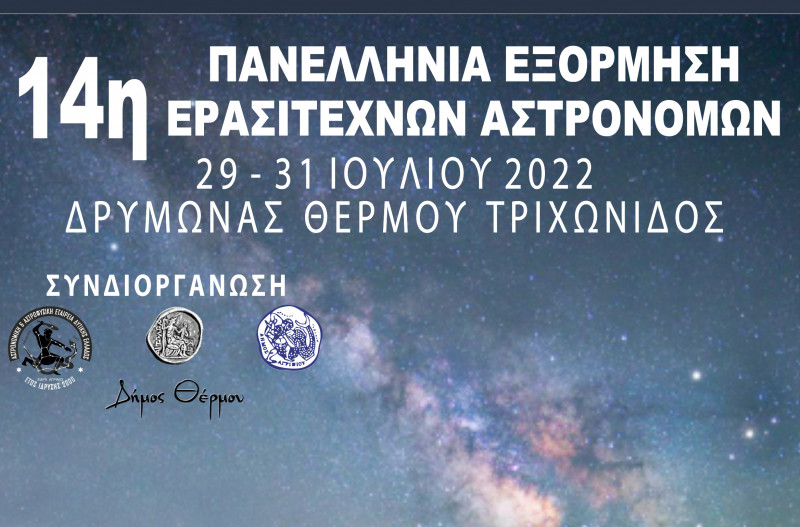 Η Αστρονομική & Αστροφυσική Εταιρεία Δυτικής Ελλάδας – «Ηρακλής», ο Δήμος Θέρμου και ο Δήμος Αγρινίου, συνδιοργανώνουν στον Δρυμώνα Θέρμου (Τριχωνίδας) του νομού Αιτωλοακαρνανίας, την 14η Πανελλήνια Εξόρμηση Ερασιτεχνών Αστρονόμων (ΠΕΕΑ) από τις 29 έως και τις 31 Ιουλίου 2022.