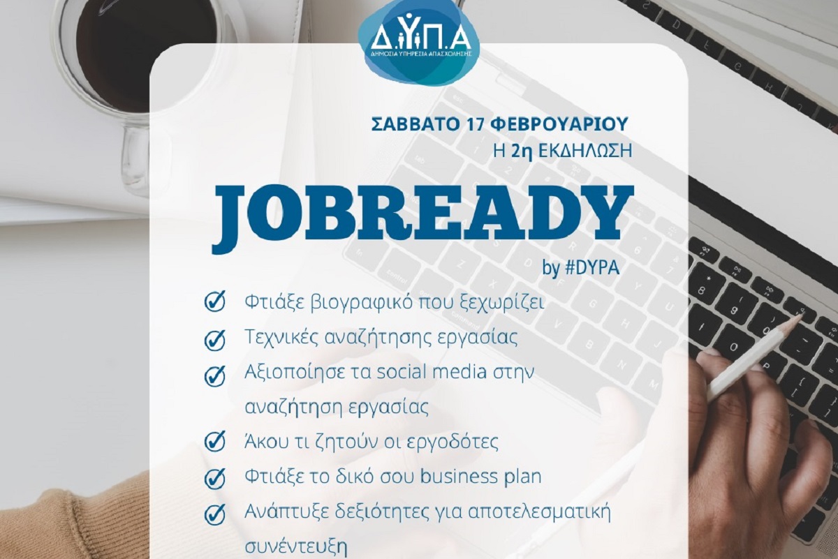 Τον Νοέμβριο η ΔΥΠΑ προχώρησε στη διοργάνωση του «JobReady by DYPA», μίας εκδήλωσης που αφορούσε αποκλειστικά την παρακολούθηση workshops συμβουλευτικής παράλληλα με ομιλίες στελεχών επιχειρήσεων για την επαγγελματική ανάπτυξη και εξέλιξη. Η συμμετοχή ήταν αθρόα και, έτσι, η ΔΥΠΑ επανέρχεται με το 2ο «JobReady» το Σάββατο, 17 Φεβρουαρίου στο ξενοδοχείο Wyndham Grand Athens (Μεγ. Αλεξάνδρου 2, 10437, Αθήνα, στάση μετρό Μεταξουργείο).