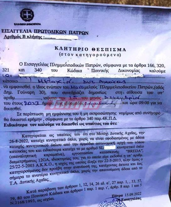 Παρακάτω, βλέπετε κλήτευση σε δίκη που αφορά άνδρα που διέμενε σε χωριό της Δυτικής Αχαΐας.