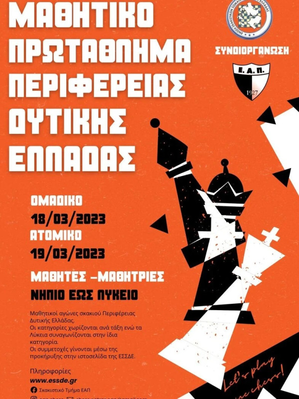 Η Ένωση Σκακιστικών Σωματείων Δυτικής Ελλάδας και η Ένωση Αθλοπαιδιών Πατρών προκηρύσσουν Ατομικό Πρωτάθλημα Μαθητών Μαθητριών Περιφέρειας δυτικής Ελλάδας (19 Μαρτίου 2023 ) και το Ομαδικό Πρωτάθλημα Μαθητών Μαθητριών Περιφέρειας δυτικής Ελλάδας (18 Μαρτίου 2023).